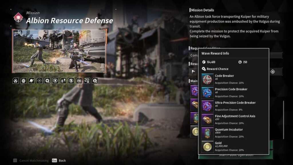 进行每日入侵后,下一个最佳黄金农场是困难难度特别行动。您可以通过阿尔比恩中心区域的航站楼访问特别行动。有两种轮换的特殊行动——你想玩哪个就玩哪个,但是阿尔比恩资源防御任务通常更快更容易完成。