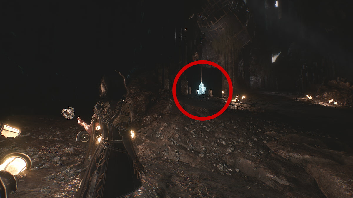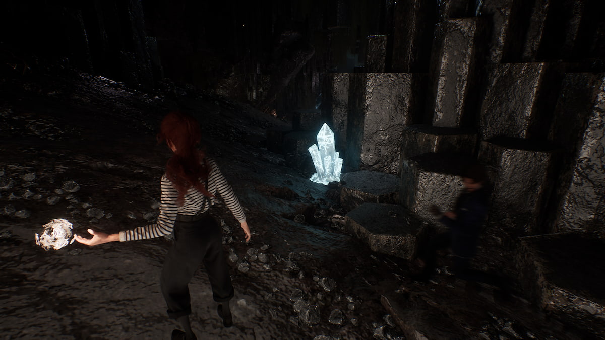 经过海克斯加并进入前面的洞穴。然后,使用抓斗越过并使用绳索将自己降低。当你向前直落时,你会看到第一块有光泽的岩石,但问题是旁边有一些敌人。你可能需要摆脱它们才能访问它,或者你可以尝试潜入。完成后,敲击发光的岩石并捡起水晶。