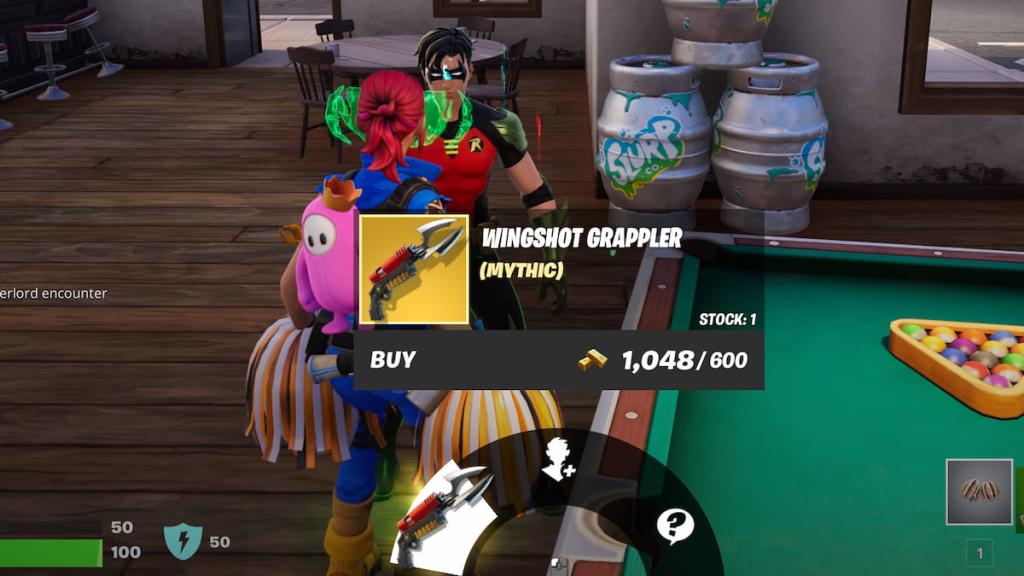 伴随这个任务的是他的第一个服务:翼射抓斗者商店。在每场《堡垒之夜》比赛中,您可以用 600 个金条从罗宾那里购买一件翼射抓斗器。您可以这样做来完成罗宾的任务,或者作为快速获得这个有用的遍历工具的方法。