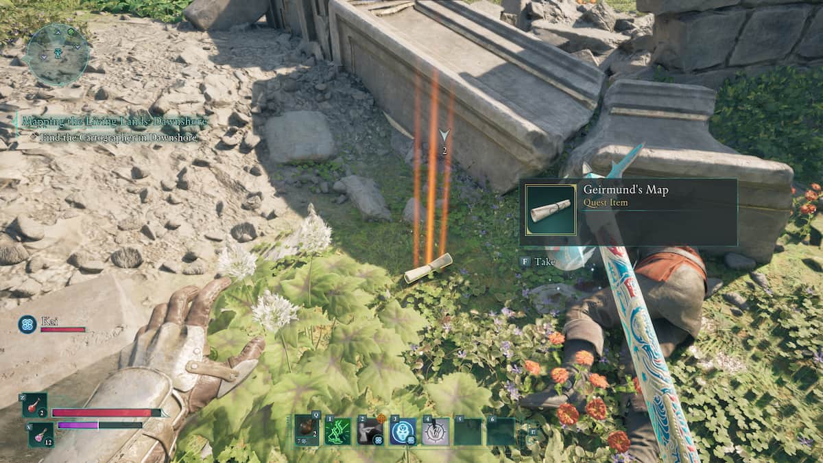 击败骷髅后,沿着岩石前往废墟的北部地区,找到盖尔蒙德的尸体。他没有参加这次探险。不过,你可以在地面上找到他的地图。抓住它,你就可以把它带回给桑扎,他正等着从你手中买下它。