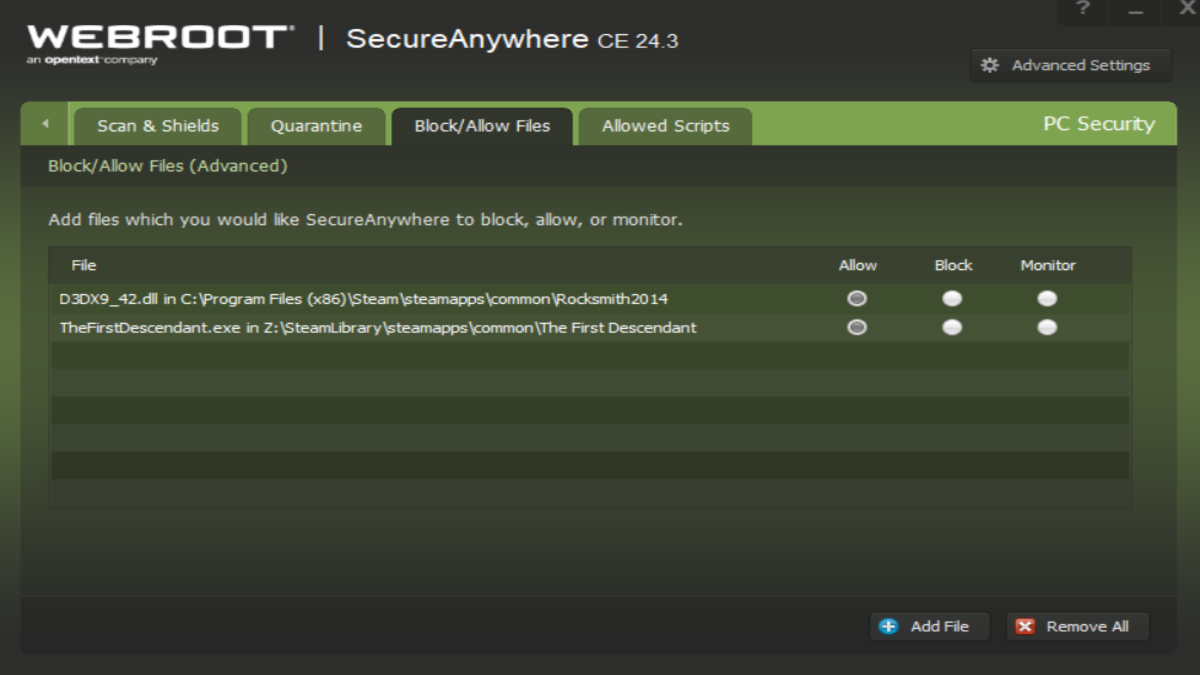 如果您使用 Webroot、Bitdefender、McAfee 或 Norton 等防病毒软件,您会想看看它们是否已将《第一后裔》的其中一个文件标记为病毒。您可以通过进入软件的隔离部分来执行此操作。之后,将 The First Descendant 的文件夹和 TheFirstDescendant.exe 可执行文件添加到程序的白名单中,以防止将来出现问题并阻止您可能会看到的 The First Descendant 口吃问题。