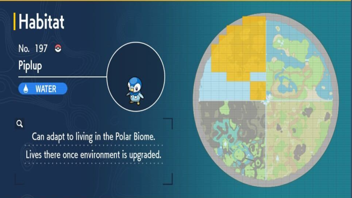 | 皮普拉普 | Piplup 有很高的机会出现在极地生物群系冰冷区域的任何地方。 | ![]() |