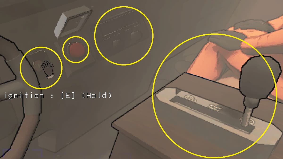 - 看着位于方向盘右侧的点火开关,按下“E”键插入车钥匙。