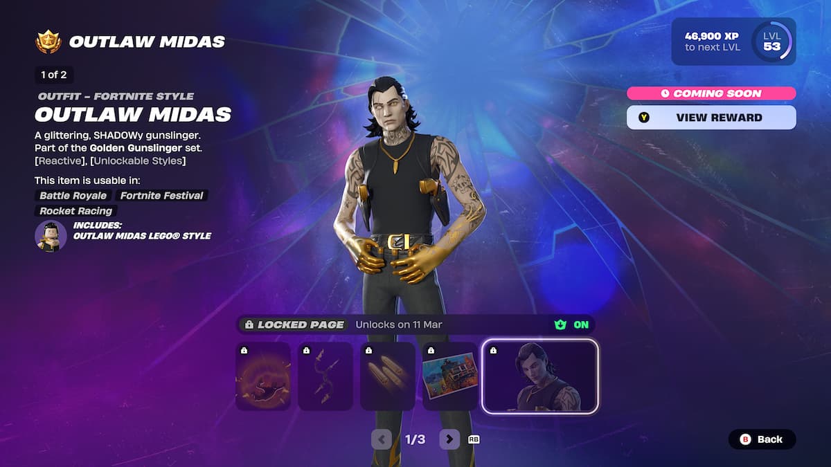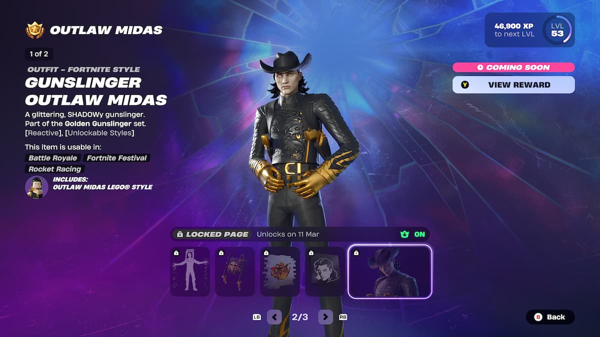 Outlaw Midas 奖励通行证的第一页包括闪亮的全新镀金光环轨迹、Outlaws Whipknives 镐、Bullet Rider 滑翔机、加载屏幕以及作为 Outlaw Midas 基础服装的帮派头目本人,包括乐高 Fortnite 风格。