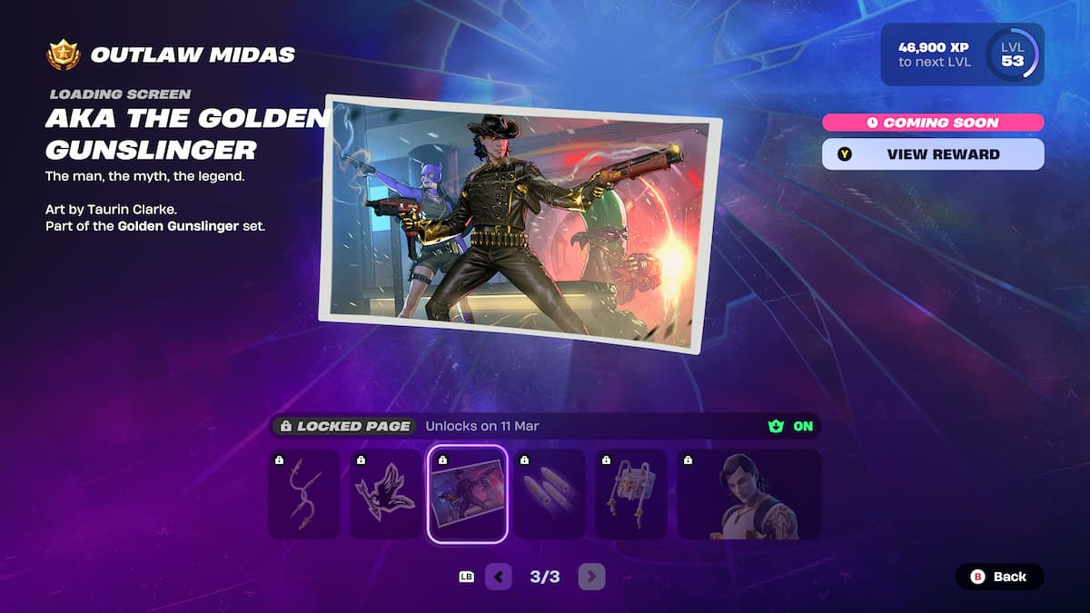 《亡命之徒迈达斯》在第二季战斗通行证第六章中有三页奖励,总共需要 32 个关卡才能获得所有奖励。