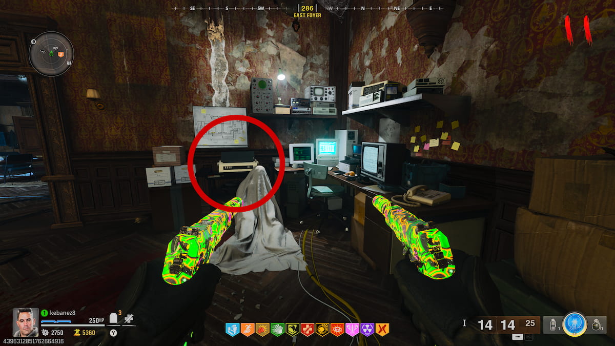 与《死者城堡》中的邮票一样,在第 11 轮左右,穿着实验室外套的僵尸会掉落一张软盘。这些敌人似乎在地下生成,所以你应该前往 S.A.M.靠近 Pack-a-Punch。将软盘与传真机(Stamin-up 室)一起使用,在一张纸上为您提供唯一的代码字。那些没有看到这篇文章的人应该触发下一轮。您必须将这个单词中的每个字母翻译成数字,不幸的是,答案会随着每次游戏的进行而变化。