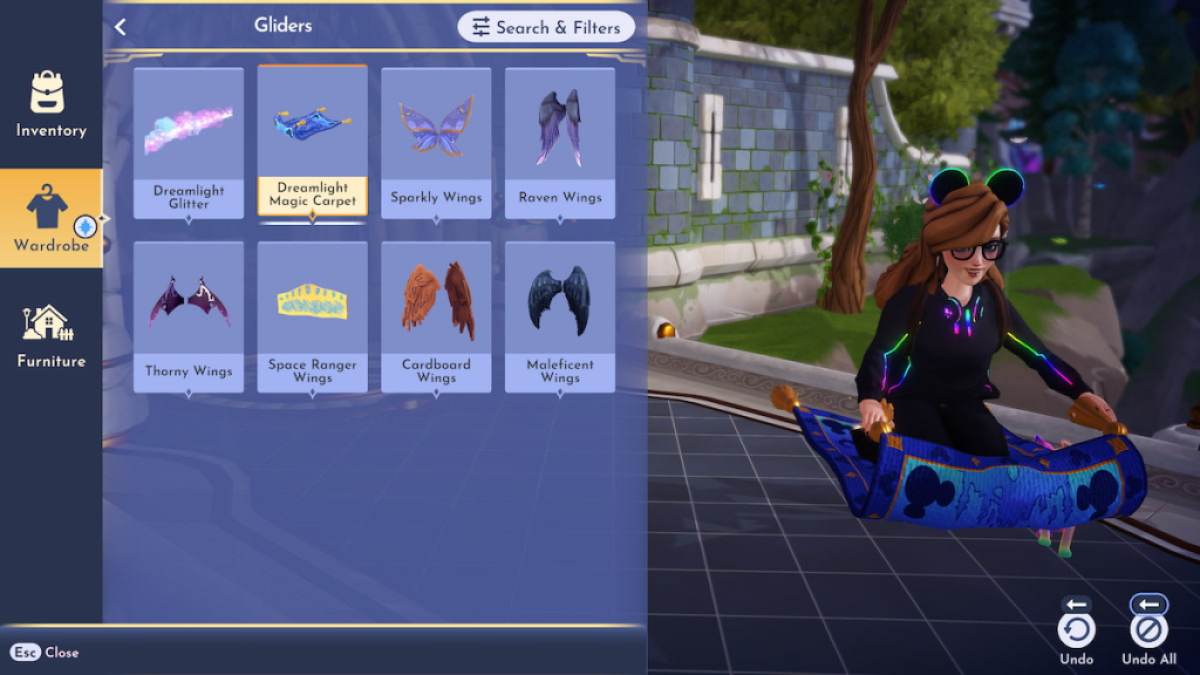 一旦您在阿拉丁的任务中解锁魔毯同伴和梦光魔毯滑翔机,您就会在同伴和滑翔机自定义菜单中找到它们。要访问这些,请进入您的库存,选择衣柜,然后选择其中之一同伴或者滑翔机。同伴菜单出现在列表顶部附近,而滑翔机则位于底部,旁边是服装和隐藏类别页面。