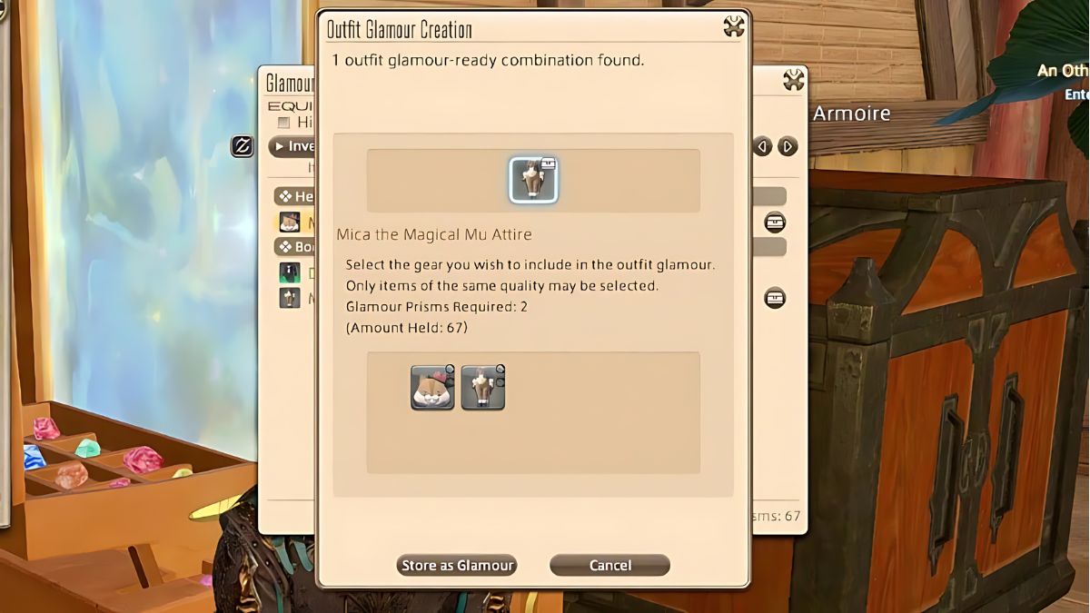 使用存储在服装魅力下的物品制作魅力与以前完全相同,物品的显示方式与它们在之前位置中的样子一样。唯一的区别是当您将鼠标悬停在该项目上时,窗口上会弹出一个小注释,说明它是作为服装魅力的一部分存储的。