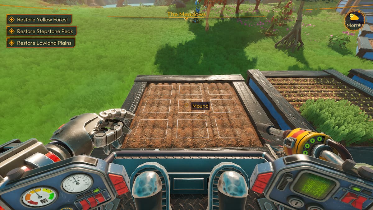 装备所需的工具后,请确保选择您想要种植的种子/芽然后用 LMB 开始种植。当你种植植物时,你会看到可用土丘的轮廓(在你制作的地块中),你可以在其中种植东西,所以只需瞄准并将这些种子射入土壤中即可。我没有发现关于阳光、一起种植某些植物等的具体规则。所以基本上,你只需种植它,给它浇水,然后就完成一天的工作。