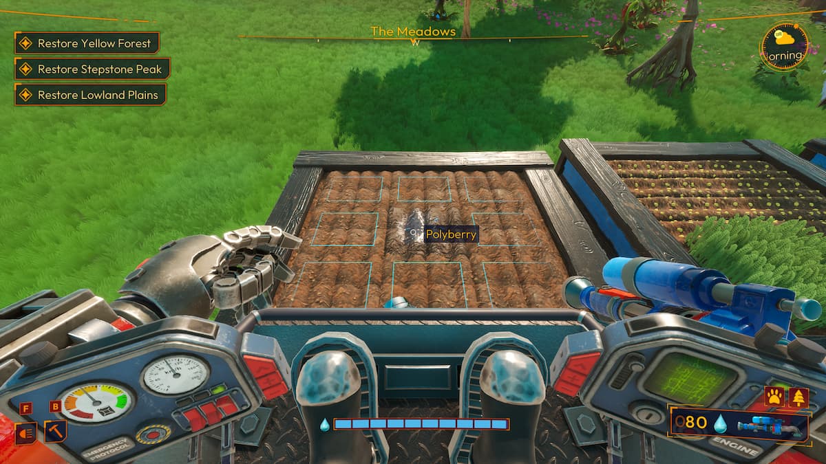 每天,你都需要给地块中的每一个“方格”浇水。您将看到每个需要淡水的方块的蓝色轮廓。我发现,如果您在瞄准要浇水的方块时轻轻点击鼠标按钮两次,就不会浪费大量水,并且该方块将被视为已浇水(它会将其颜色更改为深棕色)。在整个地块上疯狂而浪费地喷水只会让你比你需要的更频繁地走到水源处补充灌溉软管。 (这是一个关于浪费宝贵水的微妙教训,不是吗?)