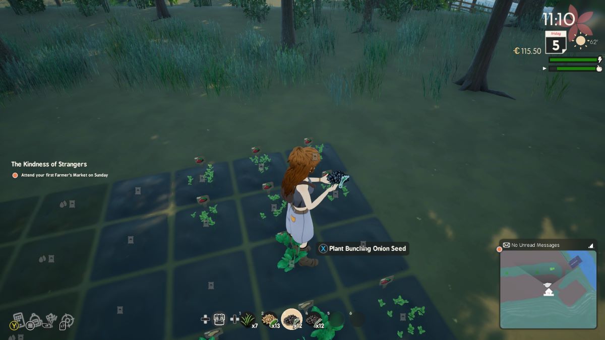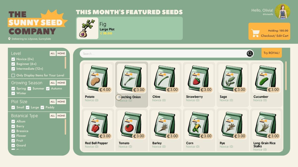 通过 Sunny Seed Company 应用程序订购种子非常简单。解锁后,您将在手机的主屏幕上找到该应用程序。您可以从一开始就订购种类繁多的植物,因此您将有很多选择来让您的农场运转并赚钱。我选择先把洋葱、细香葱和黄瓜捆起来,因为它们都不需要太多维护。为了做出最好的决定,请务必在购买前检查季节要求和施肥需求。