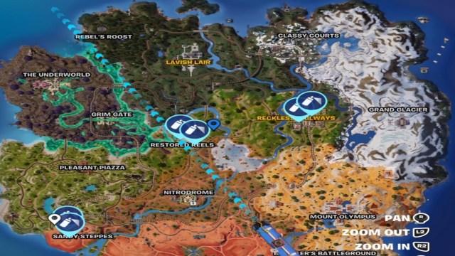 您可以在上图中看到挑战的每个可用位置。您只需要访问三个这些地方,你可以在多个游戏中完成任务。我发现沙草原上的地点很容易到达,但可以使用您喜欢的任何 POI。