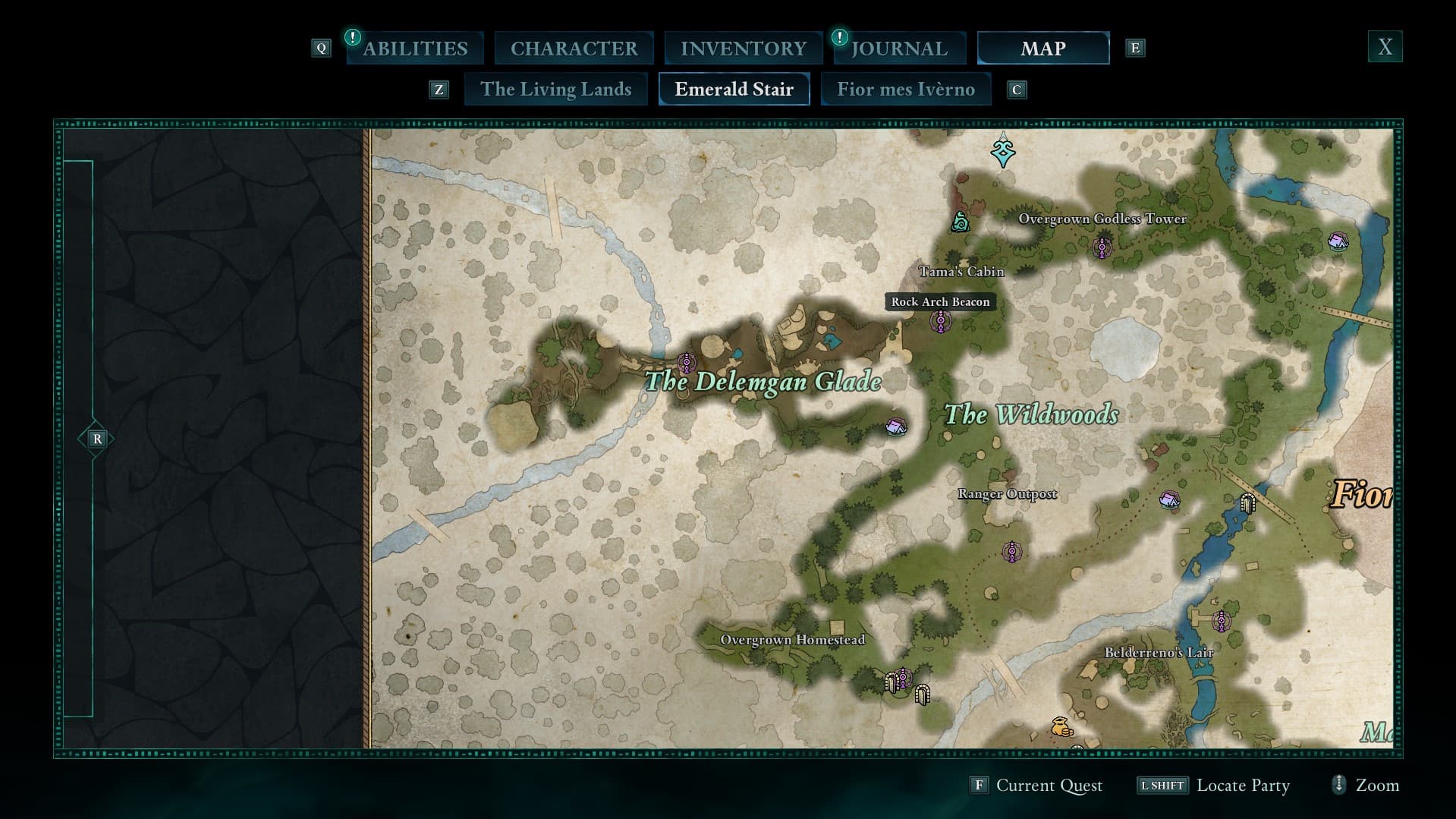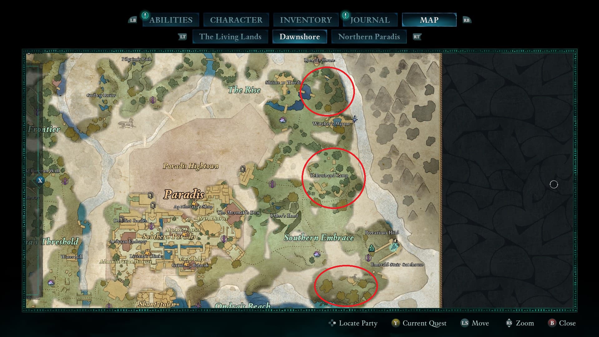 或者,返回黎明海岸并探索主城东部的森林地区和整个地图。具体来说,请参观地图上黄带营地周围、沃迪卡神殿以东和翡翠阶梯门楼以南的树木繁茂的地区。我在下面的地图截图中用红色圈出了每一个。
