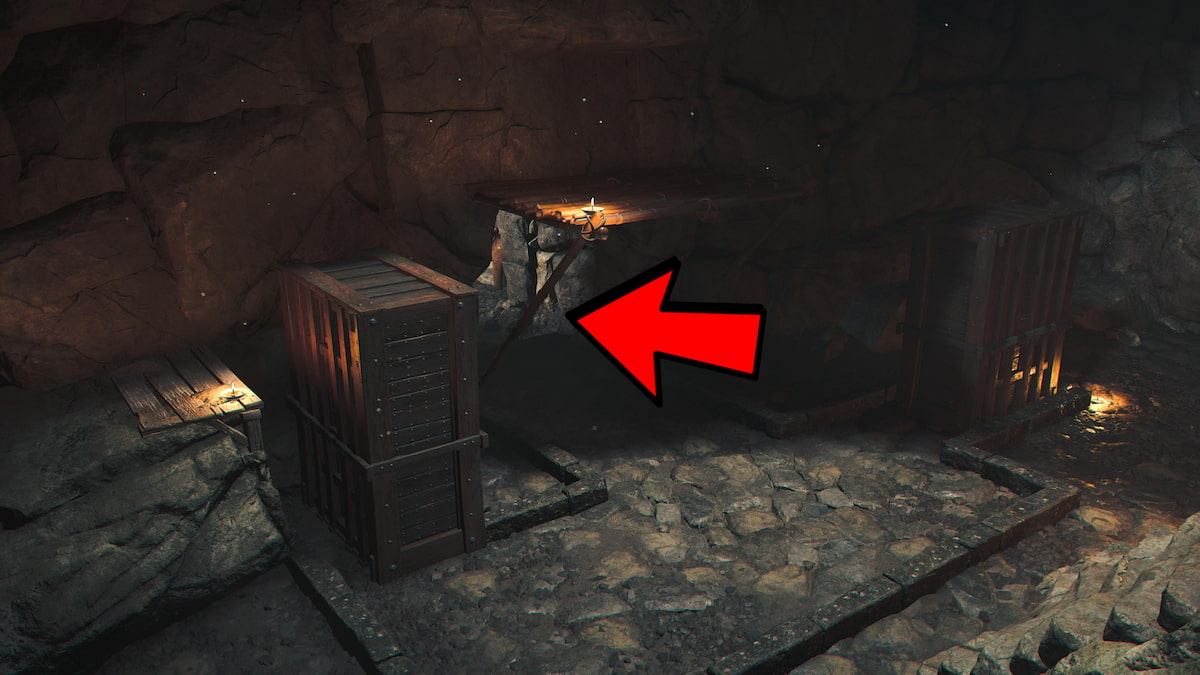 你会在这里到达一个十字路口:右转可以让你补充工具,左转则更接近附近的箱子。在左转弯处蹲下,然后跳下去。虽然看起来可以跨过绳子,但如果弥助踩上去,绳子就会断掉。相反,将木结构移动到右侧,你会在里面找到箱子。