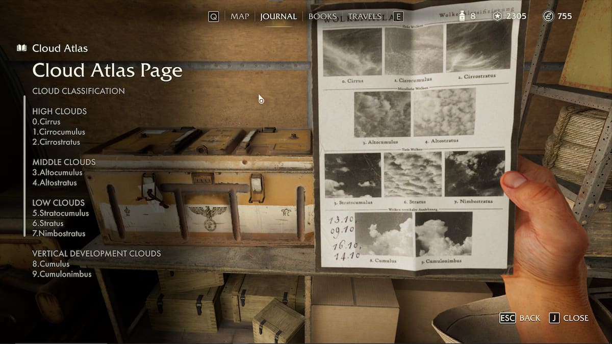 他们被派遣出去后,你将能够努力获取解开这个谜团所需的线索。它们应该位于建筑物左侧的桌子上。您要查找的两个注释将是云图页面和云状态日志。一旦您拥有它们,它们就可以在您的期刊的 Cloud Atlas 神秘页面下方找到。您需要在这些页面之间跳转以收集您需要的所有信息。