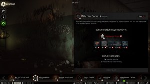 在建立农场之前,您仍然需要在藏身处建造并解锁比特币农场。它有三个不同的级别,每个级别都需要越来越难找到的物品。