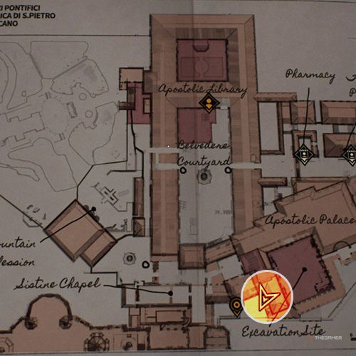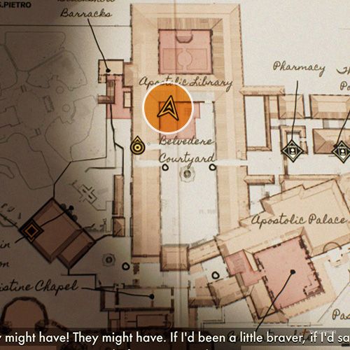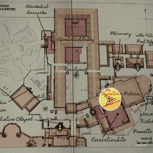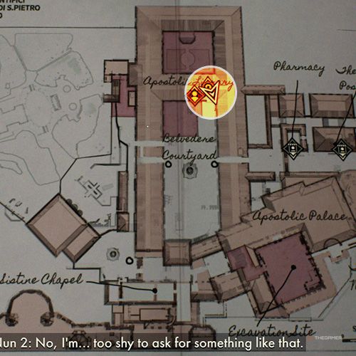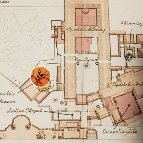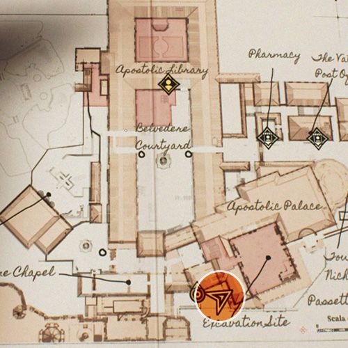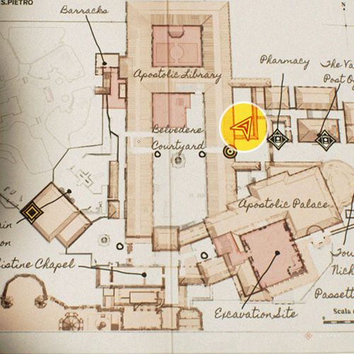 退出有龙像的房间在使徒宫左转,你就会看到一名士兵站在两座雕像之间。从他对面的窗户出去,拍一张下面梵蒂冈发掘的照片。 | ||