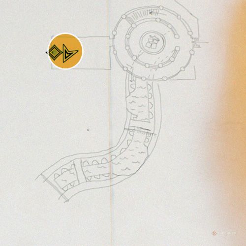 获得之前的奇怪铭文后,离开挖掘场并重新进入使徒宫建筑。向右移动并通过楼梯到达大房间;您可以在这里拍摄天花板的照片。 | ||