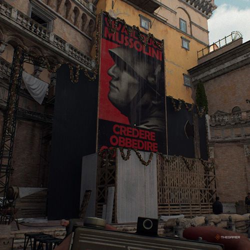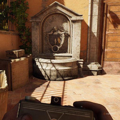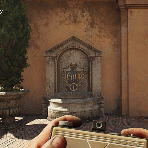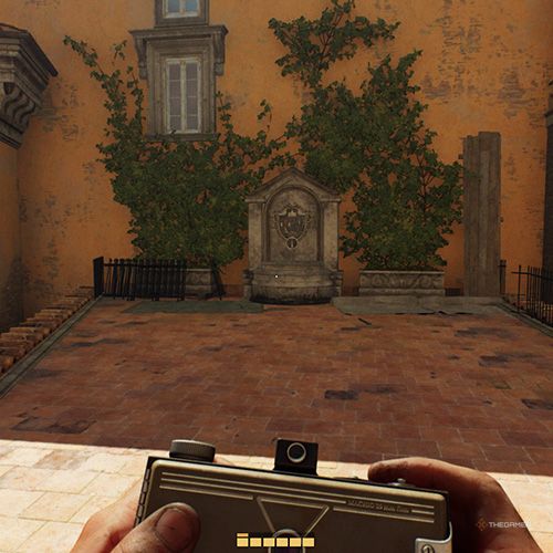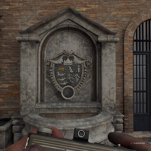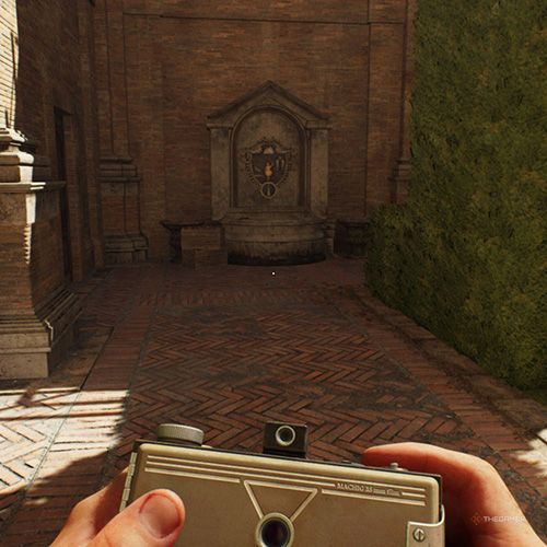 爬到脚手架顶部在丽城庭院的法西斯海报后面,你会到达类似阳台的区域。如果你右转,你会看到另一个喷泉,上面有奇怪的铭文,你可以拍照。 | ||