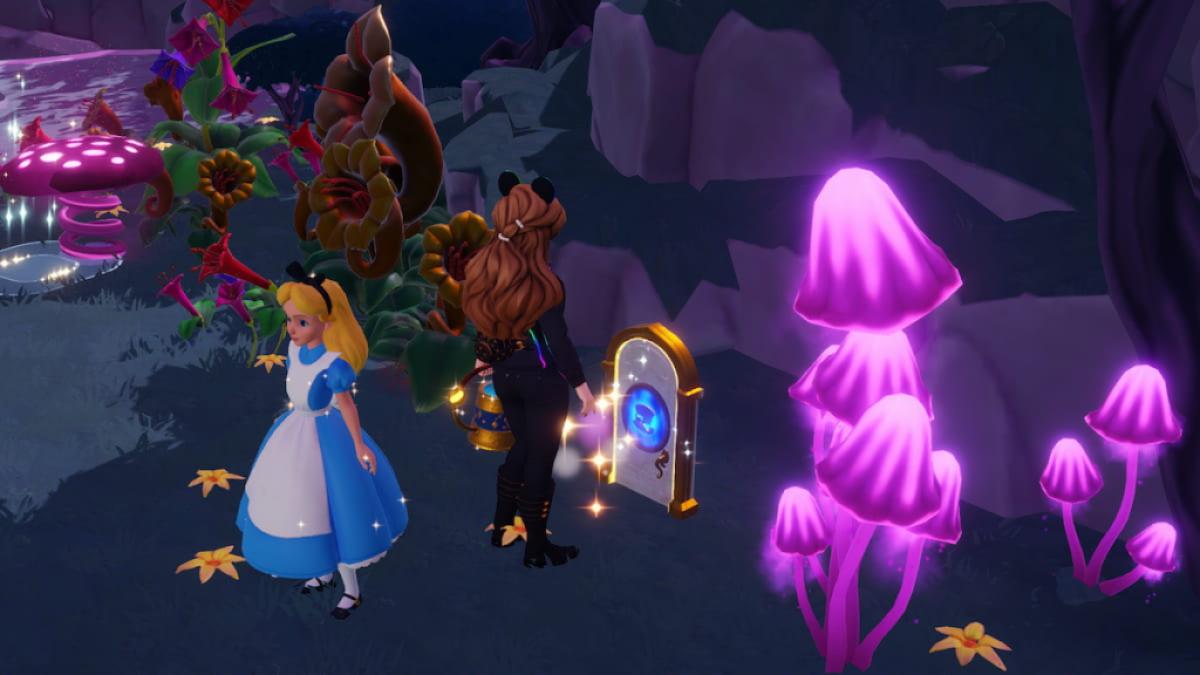 跟随爱丽丝回到领域入口,你会注意到制作台和篝火附近有四种颜色的蘑菇。尽管有四个选项,但您只需激活粉色和蓝色的蘑菇代表爱丽丝和柴郡猫。爱丽丝有一条蓝色的裙子,而柴郡猫是粉红色的。
