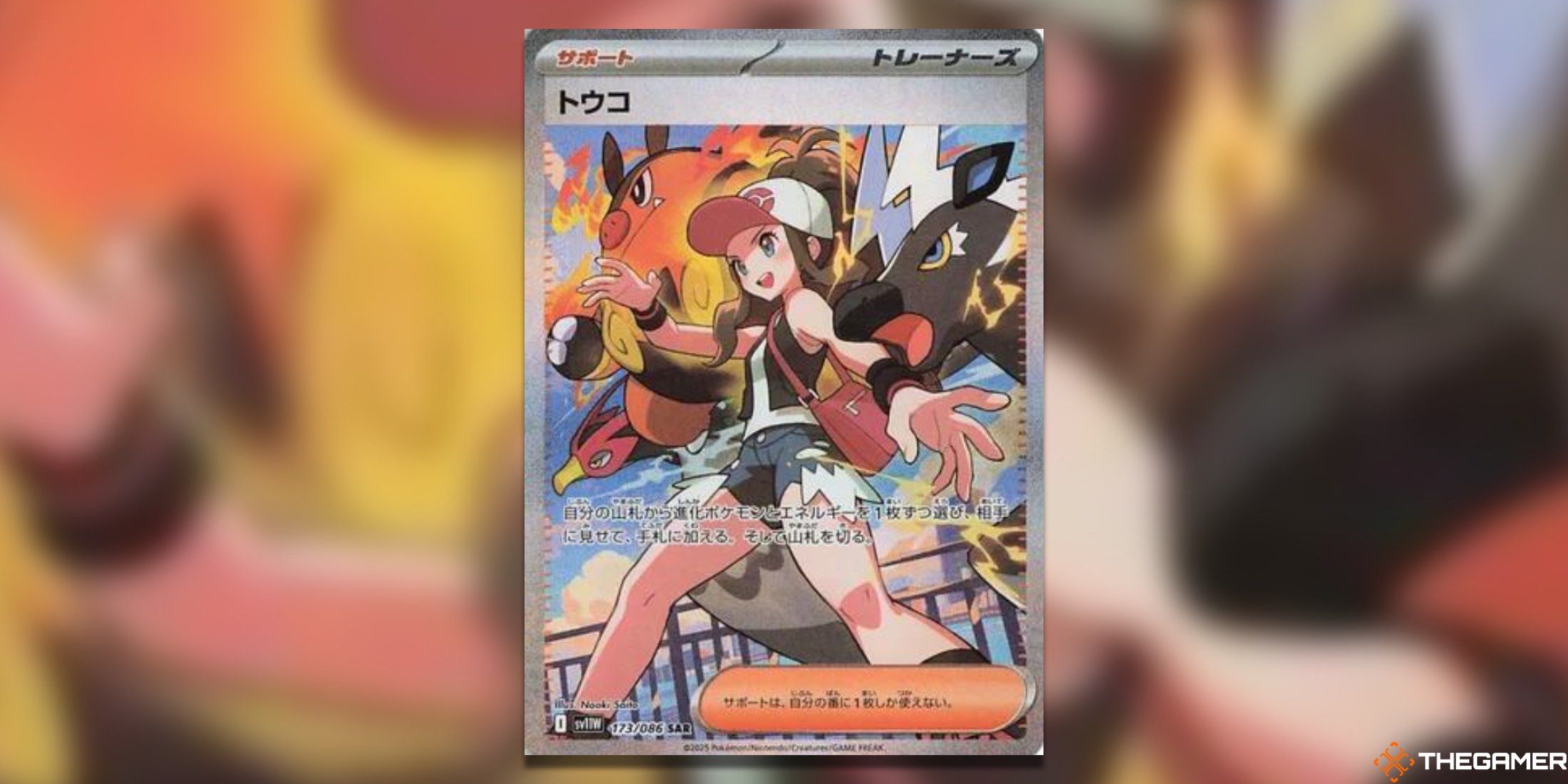 希尔达是 Pokemon TCG 中最受欢迎的训练师之一,您可以期待看到这张卡的英文版本巩固其在有史以来最有价值的全艺术训练师卡中的地位。希尔达单独的姿势在视觉上就很凶猛,而她身后的搭档神奇宝贝则让场景变得更加美好。