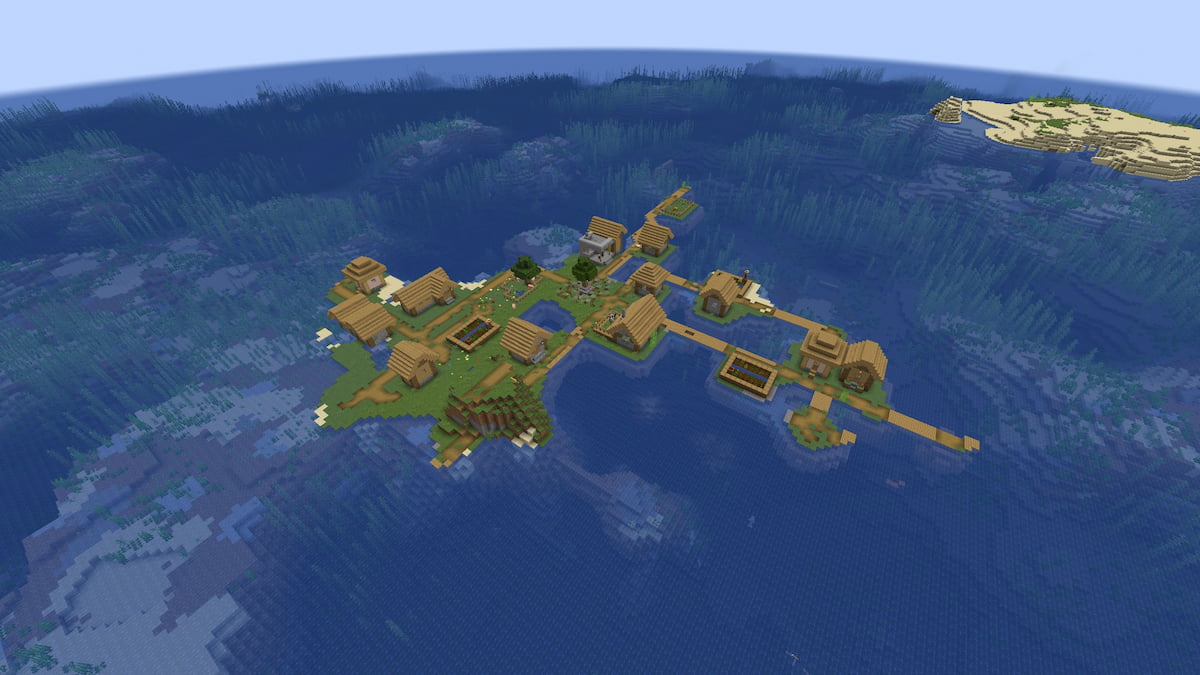 游过海洋到达出生点的北部,你会发现这个平原村庄漂浮在其他几个小岛旁边。它有两棵树、一棵铁匠和一些用于种子的草。通过探索东北部的海洋部分,你会遇到一艘沉船和一大片冷海遗迹。这是轻松的岛屿生存世界的完美环境。