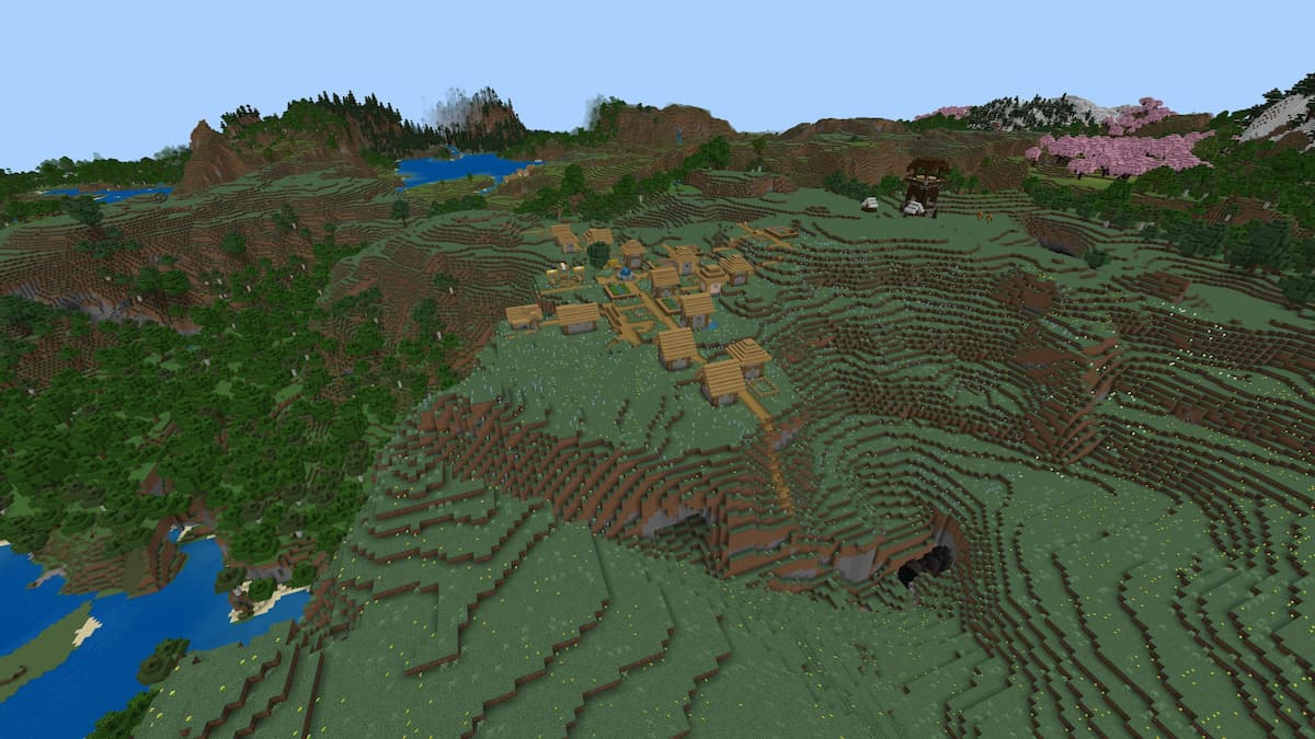 这个平原村庄所在的草甸山上点缀着向日葵。远处是另一个平原村庄、多个湖泊和明亮的樱桃林生物群落。这些的结合使世界显得幸福和平。然而,一切并不像看起来那么平静。村庄的邻居,一个掠夺者前哨站,已经开始攻击他们和任何靠近的人。你需要将他们踢下山才能开始你舒适的 Minecraft 生活。