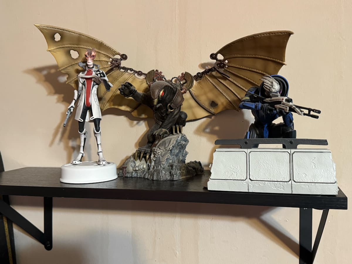 旁边的另一个架子上有《质量效应》的 Garrus 和 Mordin(“很想在贝壳上进行测试”)以及《生化奇兵:无限》的 Songbird,这两个系列对我产生了深远的影响。但墙上的上方空间是空的,充满了新事物的机会。或者也许是旧的东西。