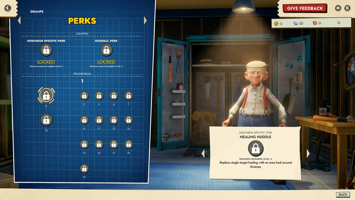 游戏没有技能树,而是在您升级英雄时自动解锁一系列特权。每个角色可装备一件邻居特定福利和一个珀克将军(总共两个技能)。顾名思义,前者对于邻居来说是独一无二的,而后者对于所有人来说都是不变的。选择那些能帮助你应对比赛的方法,无论是进攻还是防守。