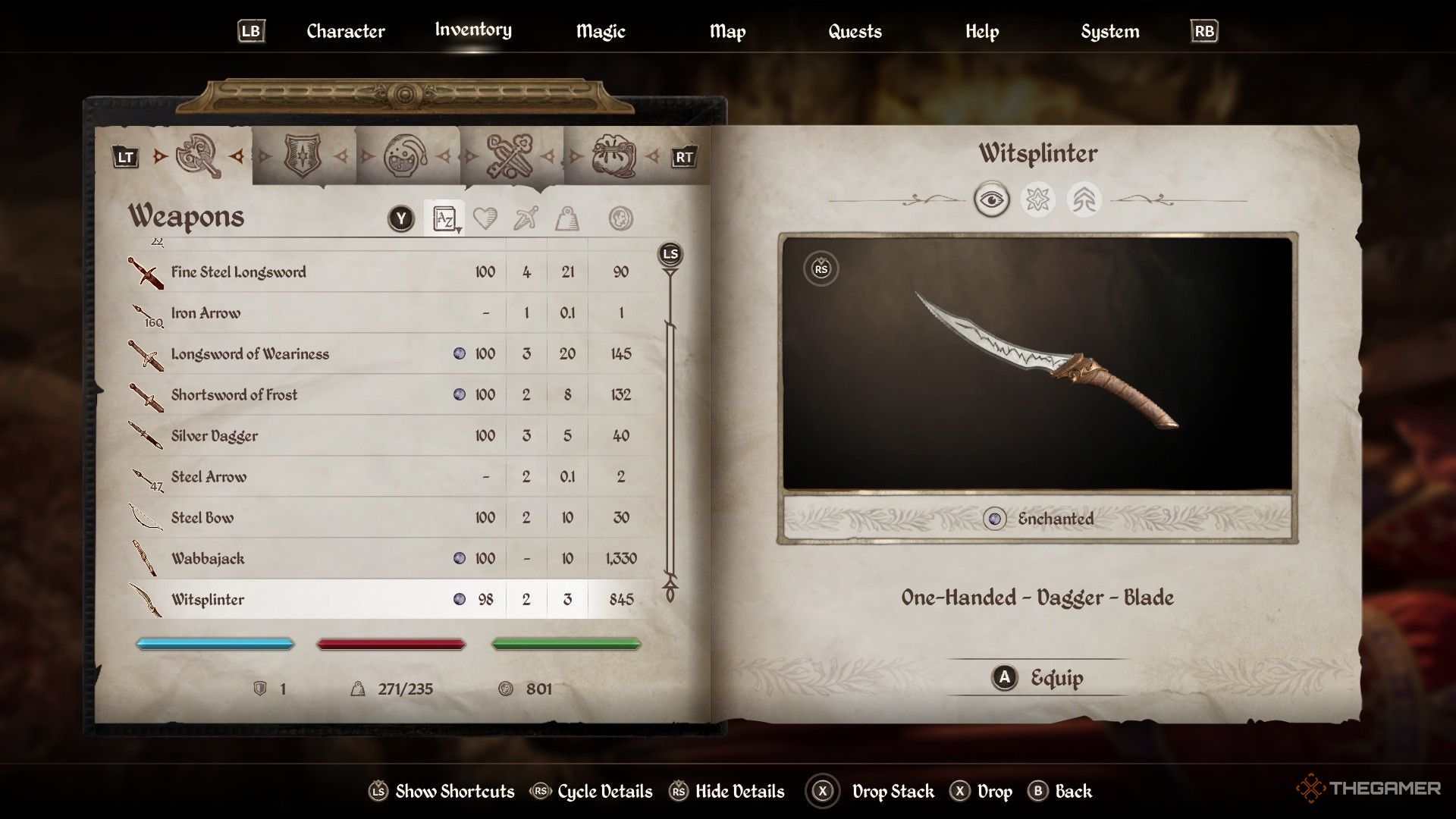 往壁炉下面看,你会发现一些武器。其中有一把名为 Witsplinter 的匕首。一定要选择它,因为它是一把附魔武器,具有吸取智力和伤害魔法效果。您还可以在这里找到钢短剑和钢匕首。