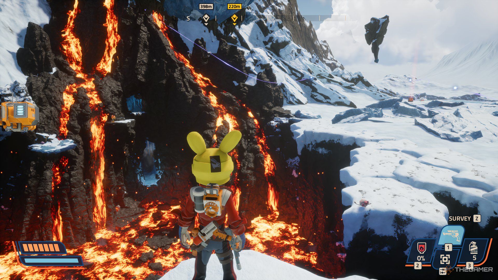 当你第一次登陆这个星球时,你应该通过一个带有岩石的传送器跳到前面。而不是直走,转身寻找磨削点。它应该在正确的,穿过熔岩的缝隙。