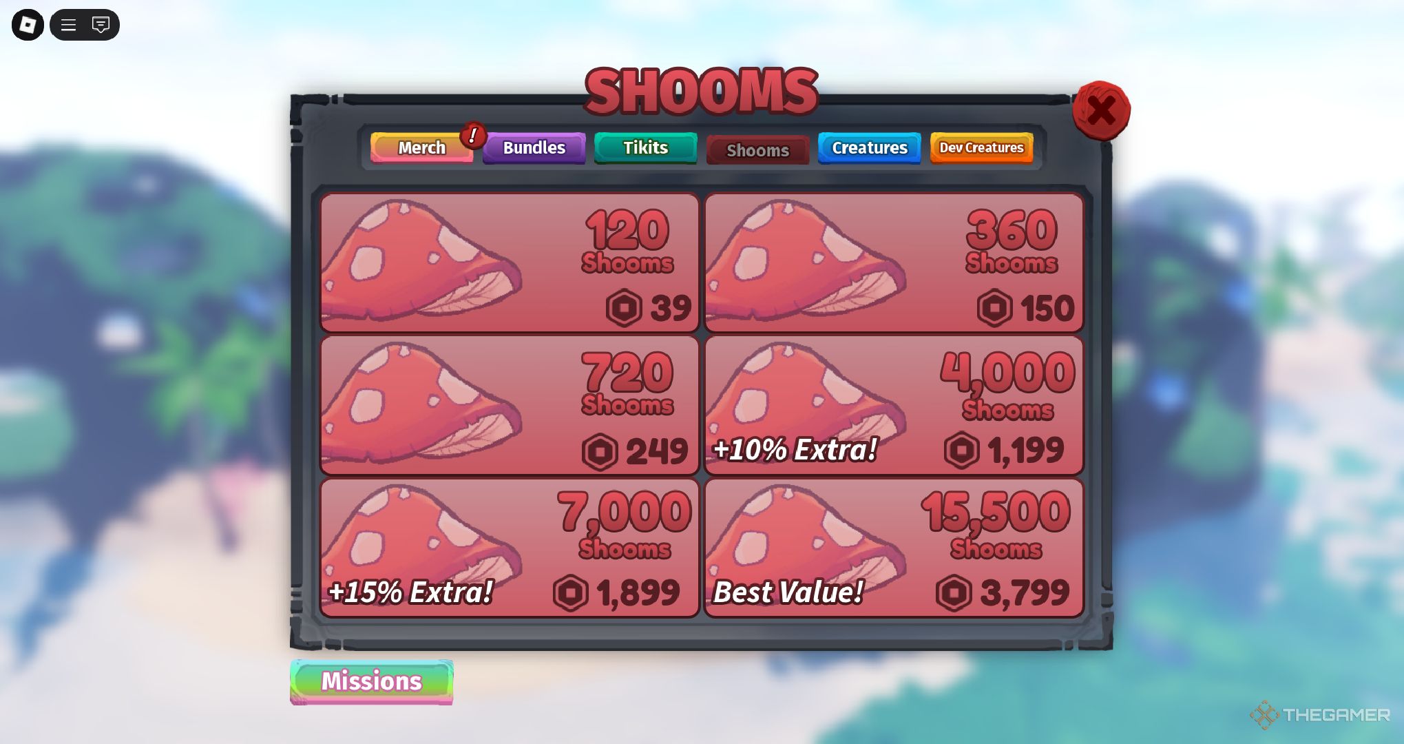 如果你想绕过之前的方法并尽快获得Shrooms,您也可以使用 Robux 购买它们。目前,可以进行以下 Shroom-Robux 交换。