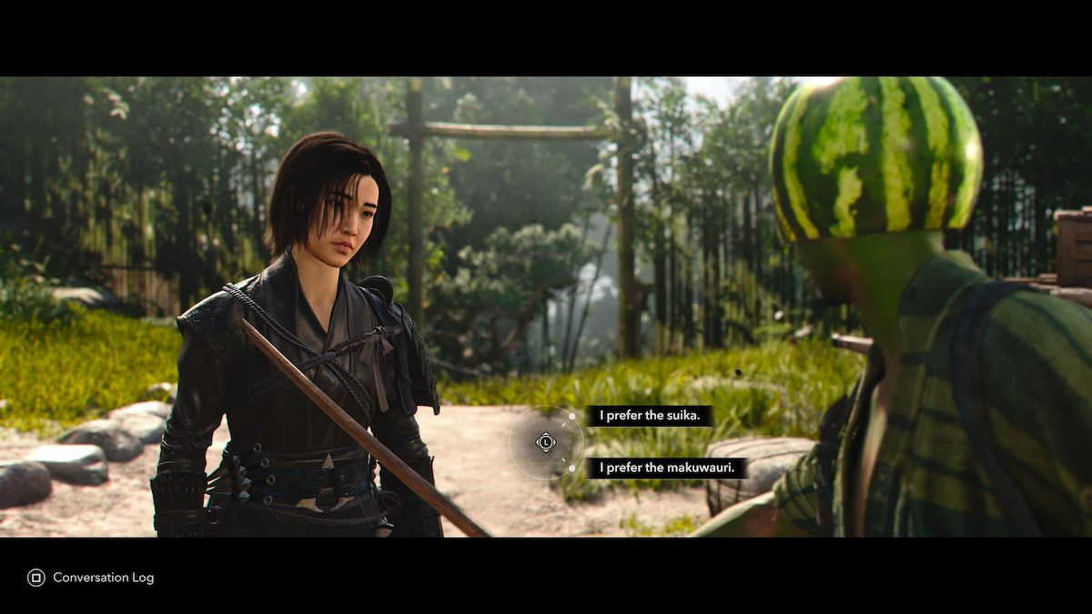 你首先会与 Suika No Bakemono(戴着西瓜的人)交谈,他会告诉你他的家族与 Makuwauri 瓜家族的战斗。然后他会问你,“你最喜欢哪一个?美味的suika,还是平庸的makuwauri?” Suika 在日语中的意思是“西瓜”,而 makuwauri 则翻译为“甜瓜”。选择这两个选项后,我推断选择哪一个并不重要,因为它们两者提供相同的奖励。我还注意到,这两个对话选项都不会影响“未知组织”的命中列表,也称为“妖怪”团体。尽管Suika是该任务线的目标之一,但您不必选择与他战斗来完成此目标。他将永远幸免。