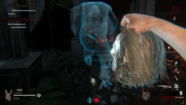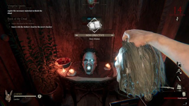 如果你是单人玩家,这部分会是一个巨大的阻力,特别是在后来的浪潮中。你必须护送父亲的鬼魂到几个地点并击败敌人才能完成配额。问题是你必须装备母亲的头才能看到鬼魂,如果周围有敌人,很容易失去他。