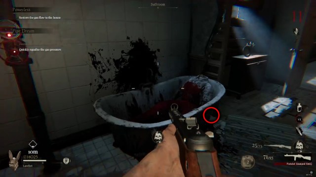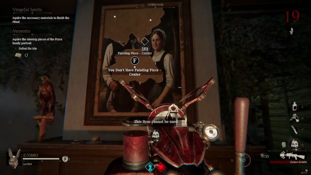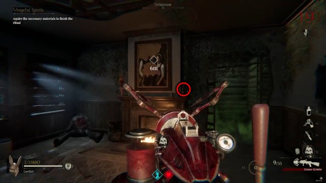 诅咒之屋里散落着三具尸体,你必须将它们全部射杀以获得必要的部件。其中一具是无头尸体客厅一角,另一个是吊人在燃烧的休息室。最后一个是那个男人楼上的浴缸。收集完所有部件后,返回仪式地点。