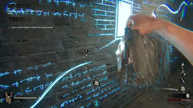 我首先启动了《死亡之书》,你可以通过打开墓地的门并收集桌子上丑陋的头颅来激活它。你不能低下头 一旦你拥有它并且可以像武器一样滚动到它。头部就像一个火炬,可以揭示隐藏的符号。