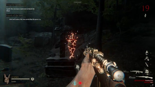 将十字放在坟墓导航标记上,系统会提示您射击四个骨灰盒。这些瓮会周期性地发出红光(如上图)表明他们很容易受到枪击。我在花园里发现了我所有的东西,所以用不了多久就能毁掉它们。抓住标记的炸药,你可以用它们炸毁之前的井。