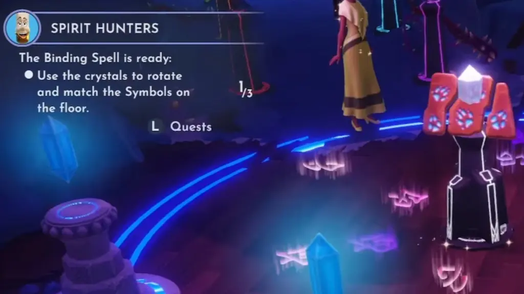 这个任务的最后一步是最困难的,因为你现在需要解决一个谜题。束缚咒周围的讲台上放置了三块水晶,您必须与每一颗水晶互动才能旋转并匹配地板上的符号。