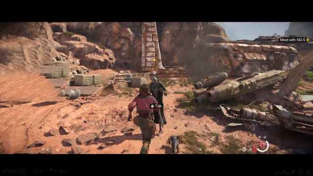 跳上你的飞行器,前往提供给你的坐标,同时从机器人本人那里了解一些关于 ND-5 债务的背景故事。地点是位于帝国领地和派克领地之间的海市蜃楼。你在飞行器坠毁时发现 ND-5,可以与他交谈以开始任务的下一部分。