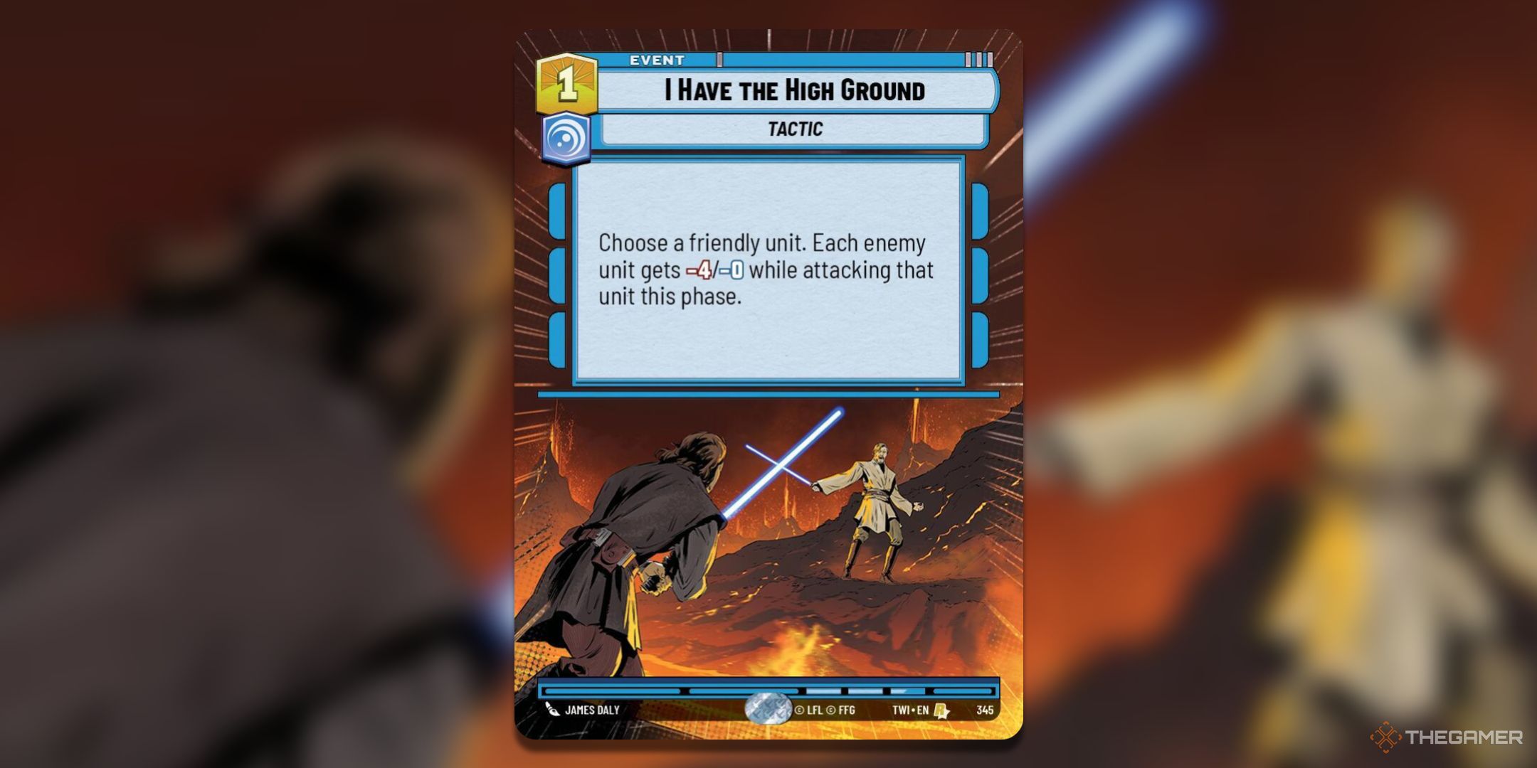 当然,阿纳金不听,在愤怒中最终失去了所有剩余的四肢。不要攻击处于高地的人。事实上,这张牌不仅描绘了这一时刻,而且还可以让你的一个单位在战斗中占据上风。