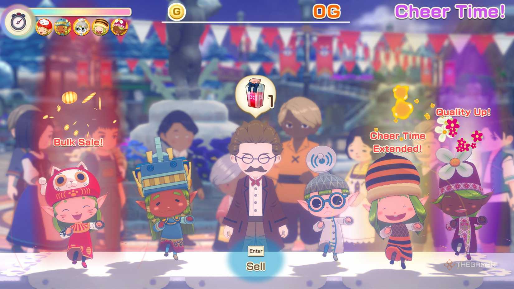 每次填满栏时,一个自然精灵的图标就会亮起。第一个图标亮起后,您可以按屏幕右下角显示的按钮呼叫啦啦队。该小队将由您点亮的所有精灵图标组成,他们将帮助您出售一堆具有各种增益的物品。