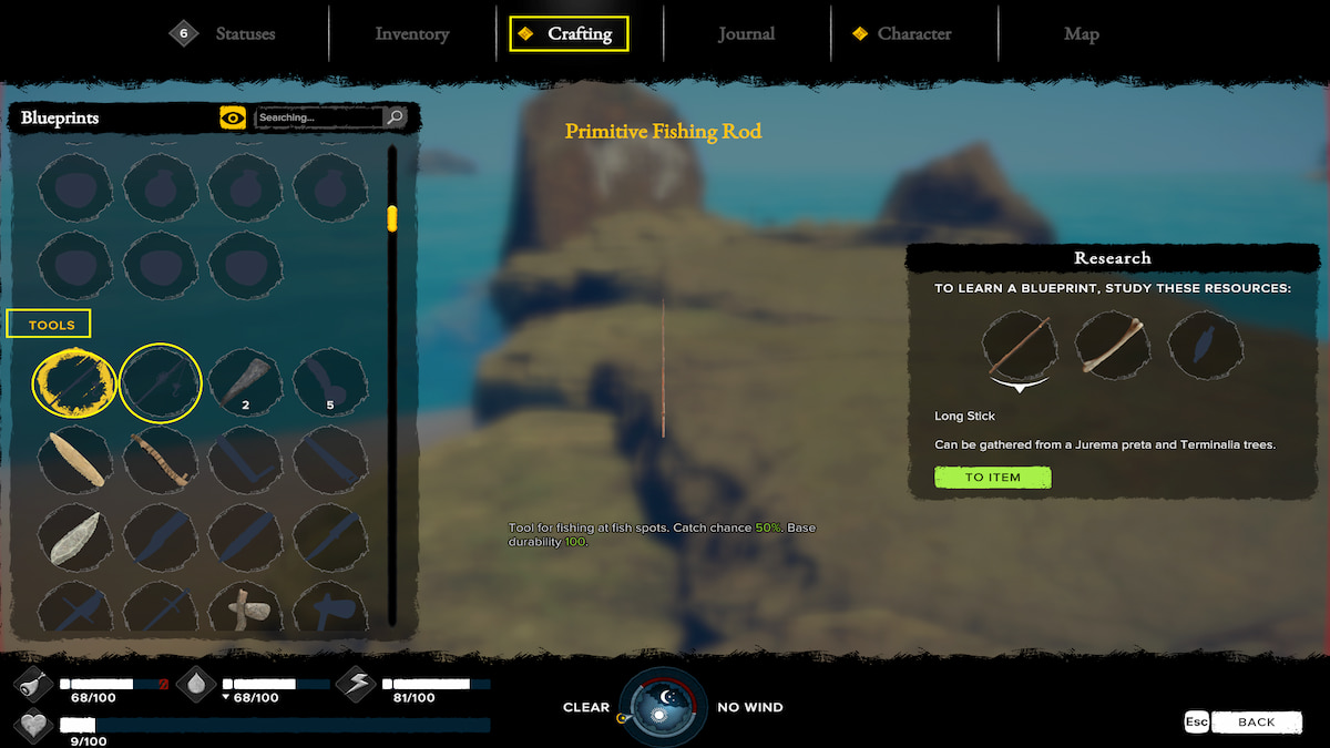 打开“制作”菜单并向下滚动到“工具”类别。在此类别中,您将有两根可以制作的钓鱼竿:原始钓鱼竿和改进的钓鱼竿。您需要几种不同类型的材料来制作它们。