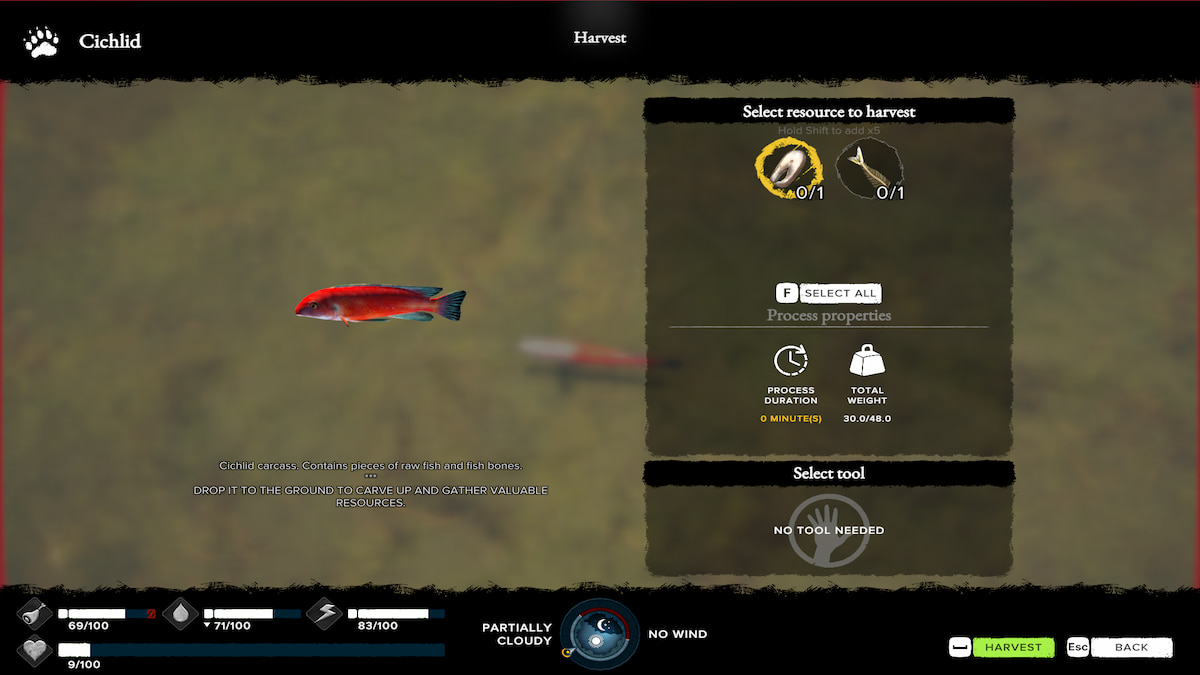 每次开始钓鱼过程时,您都会捕获随机的鱼。根据您使用的鱼饵和所在的钓鱼地点,您可能会发现更稀有的鱼类。您捕获的鱼可以用作食物或用作制作材料(带骨头)。要从中收集原料,请将鱼尸体扔到地上,然后与其互动以收获材料。