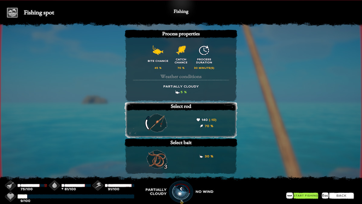 要开始钓鱼过程,请靠近竿架,您将看到弹出的“开始钓鱼”选项。一样生火,你只会有机会钓到一条鱼,根据你的鱼竿和鱼饵,机会的增加会有所增加。您可能需要多次尝试才能捕获任何东西。