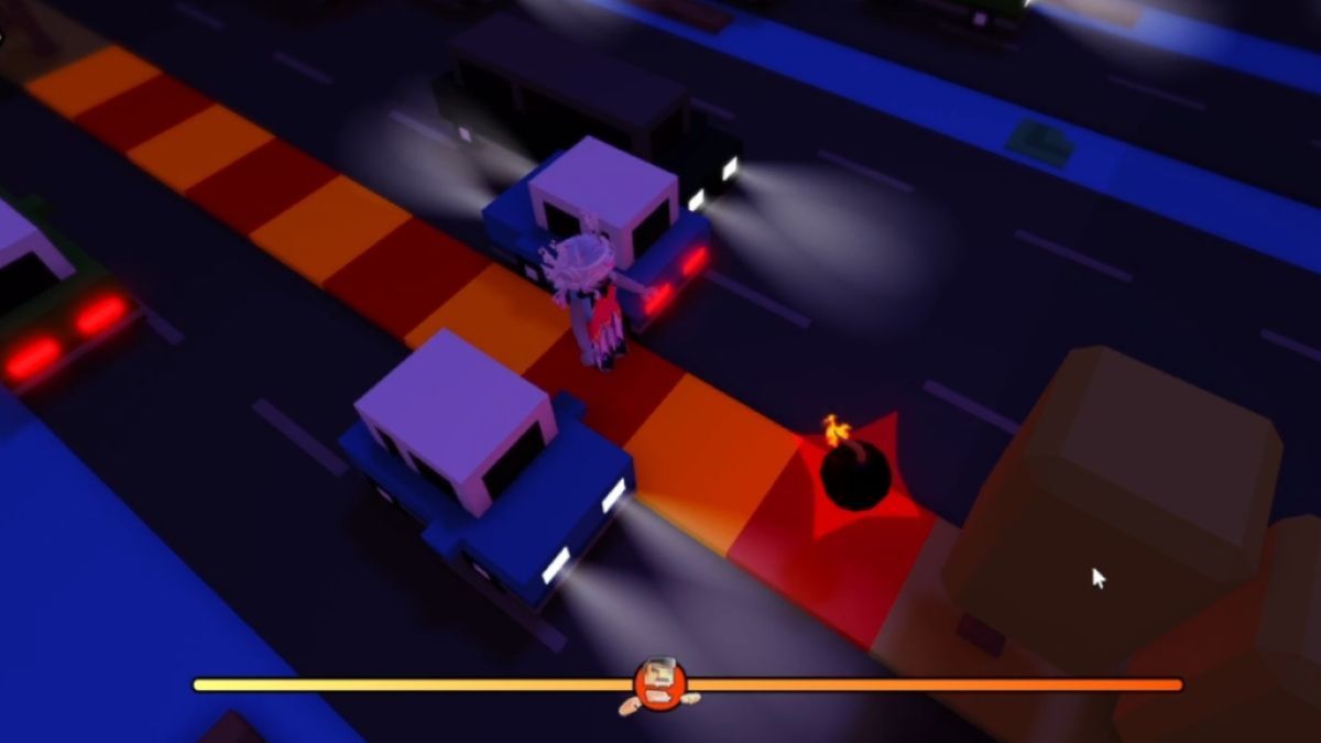 一旦你和讲台互动,就会出现一个过场动画,你妈妈会责骂你不停地玩手机游戏,过了一会儿,手机本身就会把你吸进它的系统,把你困住。现在,要逃离这个区域,你必须得分50分在克罗西·布洛克斯迷你游戏,灵感来自热门手机游戏——过马路.