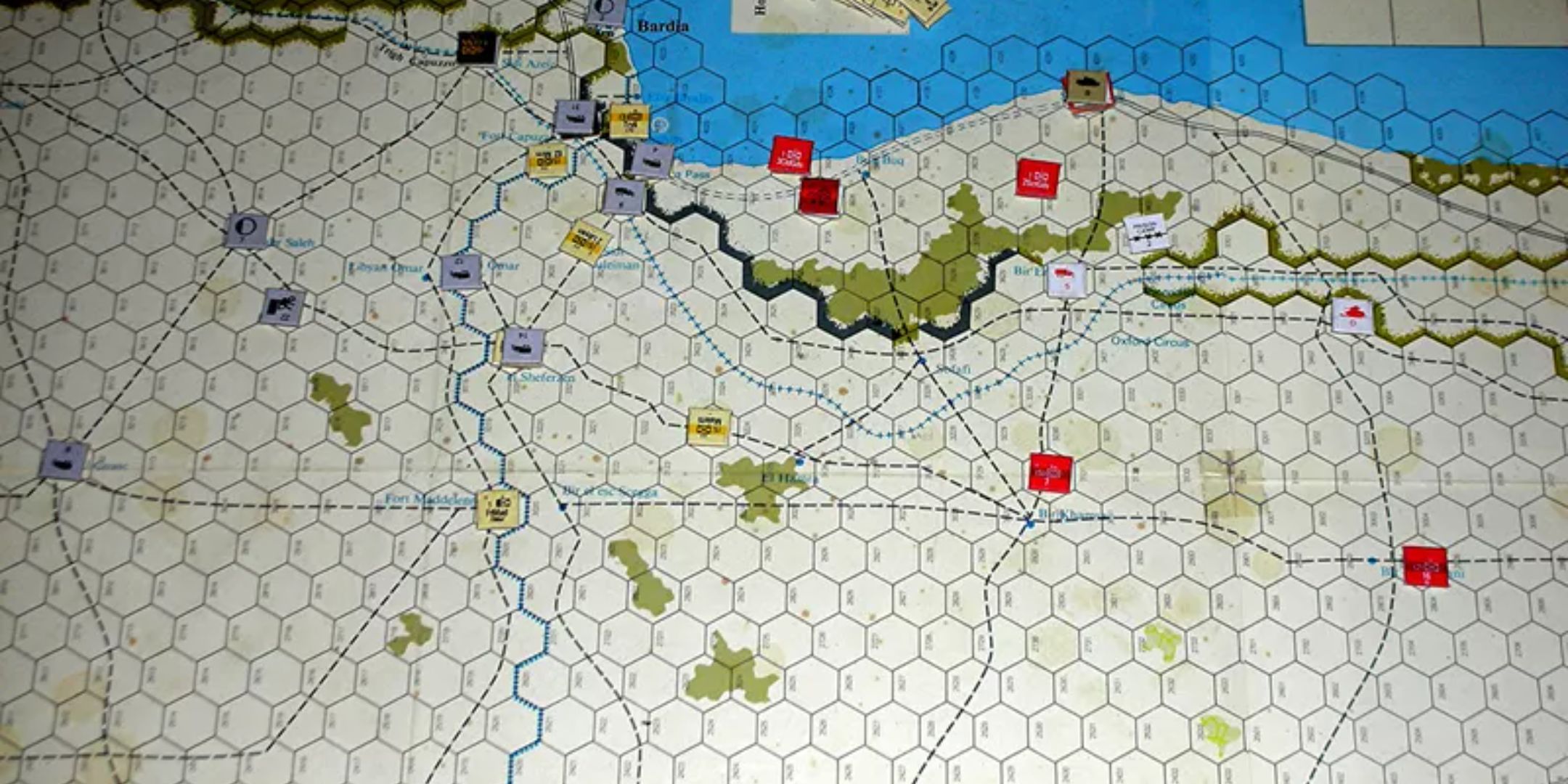如果您无法接受至少几个小时的设置,请不要购买此游戏。这幅折叠式地图确实很大,到处都有六角形,描绘了北非每 12 英里的范围。更不用说运行游戏所需的令牌、图表、时间计数器和其他部分。它是小众的,但只有几个小时的运行时间使其在初始设置后相当容易使用。