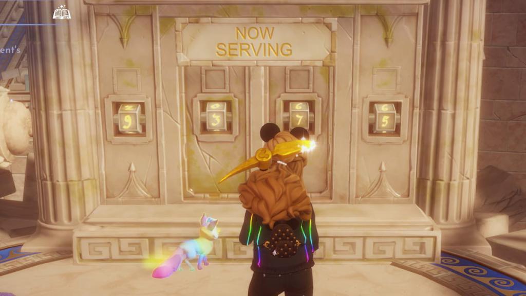 所有三张门票都有其中的数量,您需要将其输入Maleficent附近的“现在服务”板。重新安排每个数字显示解决方案9375。与每个数字进行互动,直到您获得此答案以加快队列加快,从而使您再次与魔术羽毛笔交谈。
