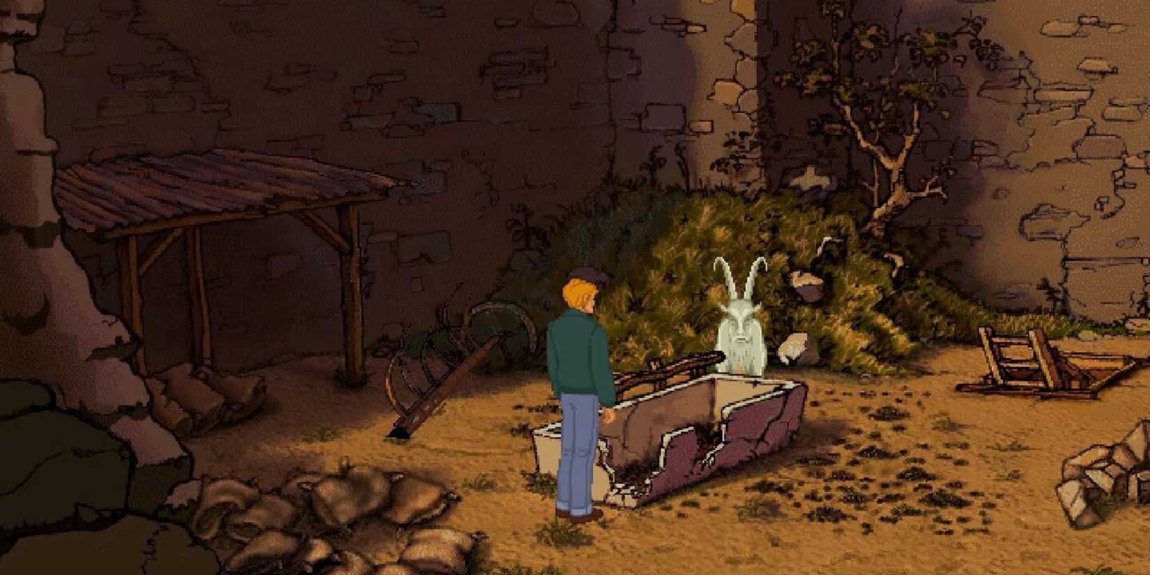 《断剑:圣殿骑士之影》的爱尔兰部分是电子游戏史上最臭名昭著的谜题之一,所有谜题都涉及一只讨厌的小山羊。山羊守卫着通往城堡下方地下遗址的梯子。如果你走向梯子,山羊会立即撞上你。如果你试图从另一个方向躲到它后面,山羊仍然会继续撞击你。