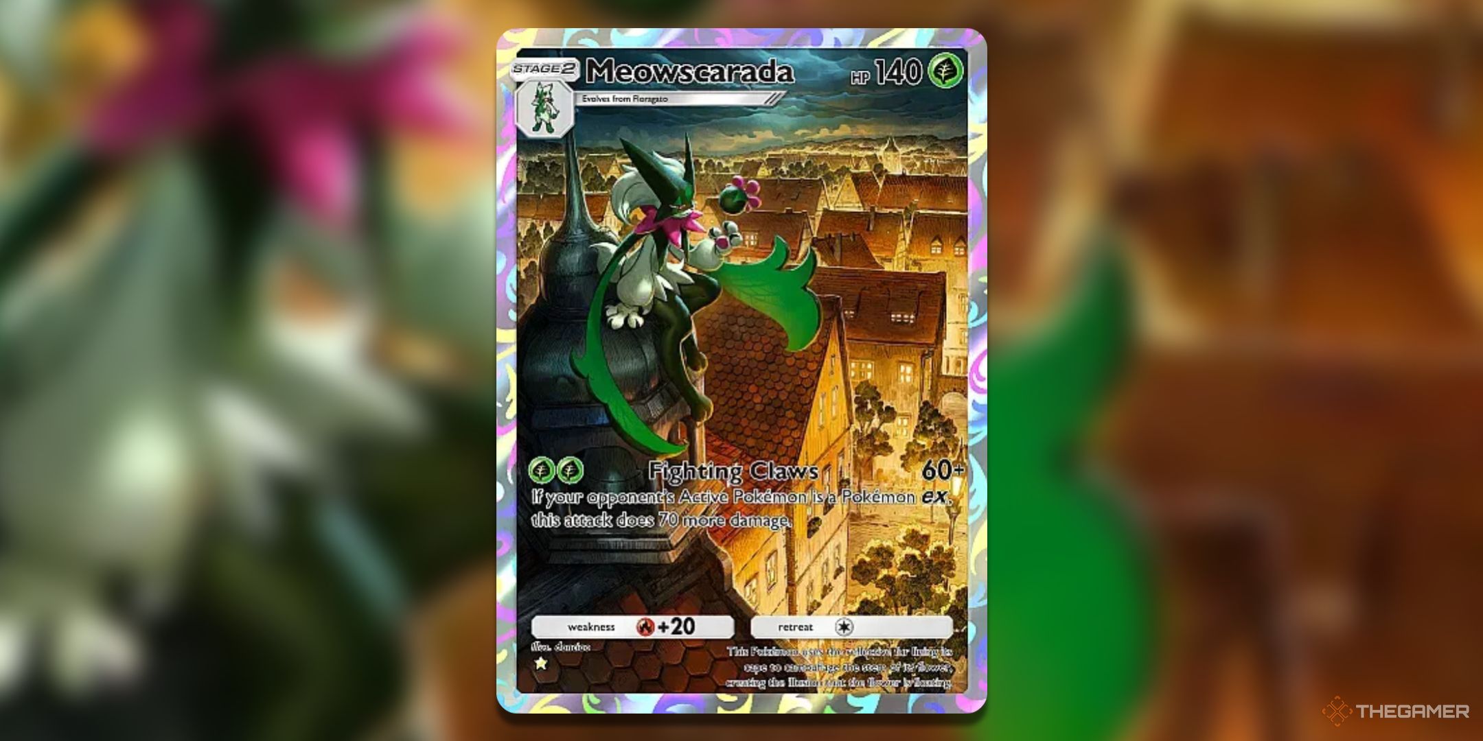 我测试了 Tatsugiri 和 Dondozo 因为他们的协同作用。那根本不起作用。我什至尝试了新的皮卡丘前身,这很有趣,但不是特别好。然后我拉了一个完整的艺术 Meowscarada。它的战斗爪攻击是前杀手,通常造成 60 点伤害,但对前口袋妖怪造成令人印象深刻的 130 点伤害。考虑到达克莱伊前任的草系弱点,只需两点能量就能一击KO。如果你事先设置了红色,那么这次攻击几乎可以一击摧毁骑拉帝纳前身。