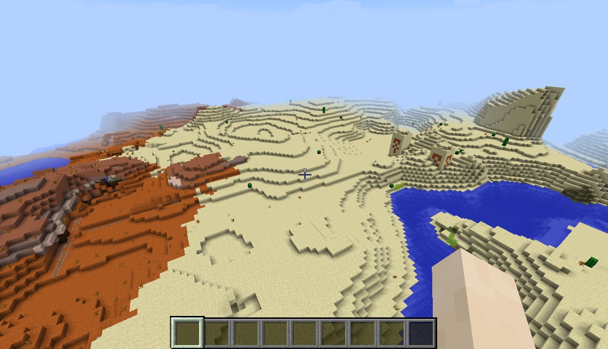 生成在台地生物群落的中间,距离坐标-168 344的热带草原村庄和坐标-376 296的沙漠神庙不远。